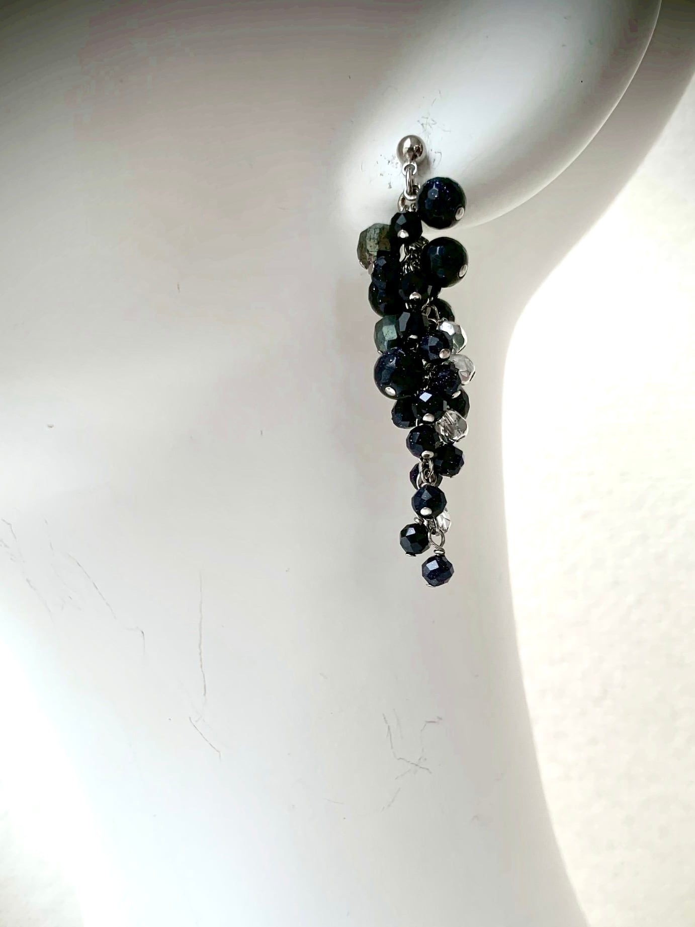 紫金石とクリスタルグラスをミックスしてブドウのように実らせた、ドラマティックなイヤアクセサリー。夜の闇で静かに光る太陽のように静かに熱を放って。