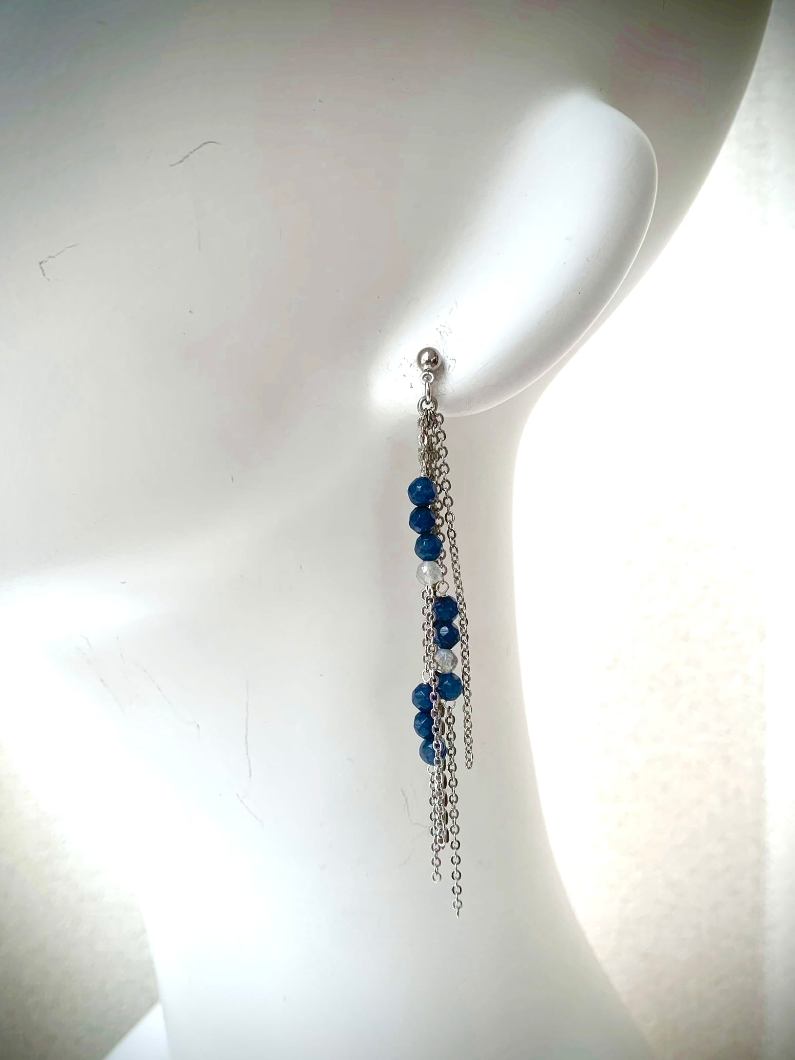 ブルーグレーのサファイアアゲートと乳白色のムーンストーンがさらりと揺れるロングイヤリング / ピアス。
