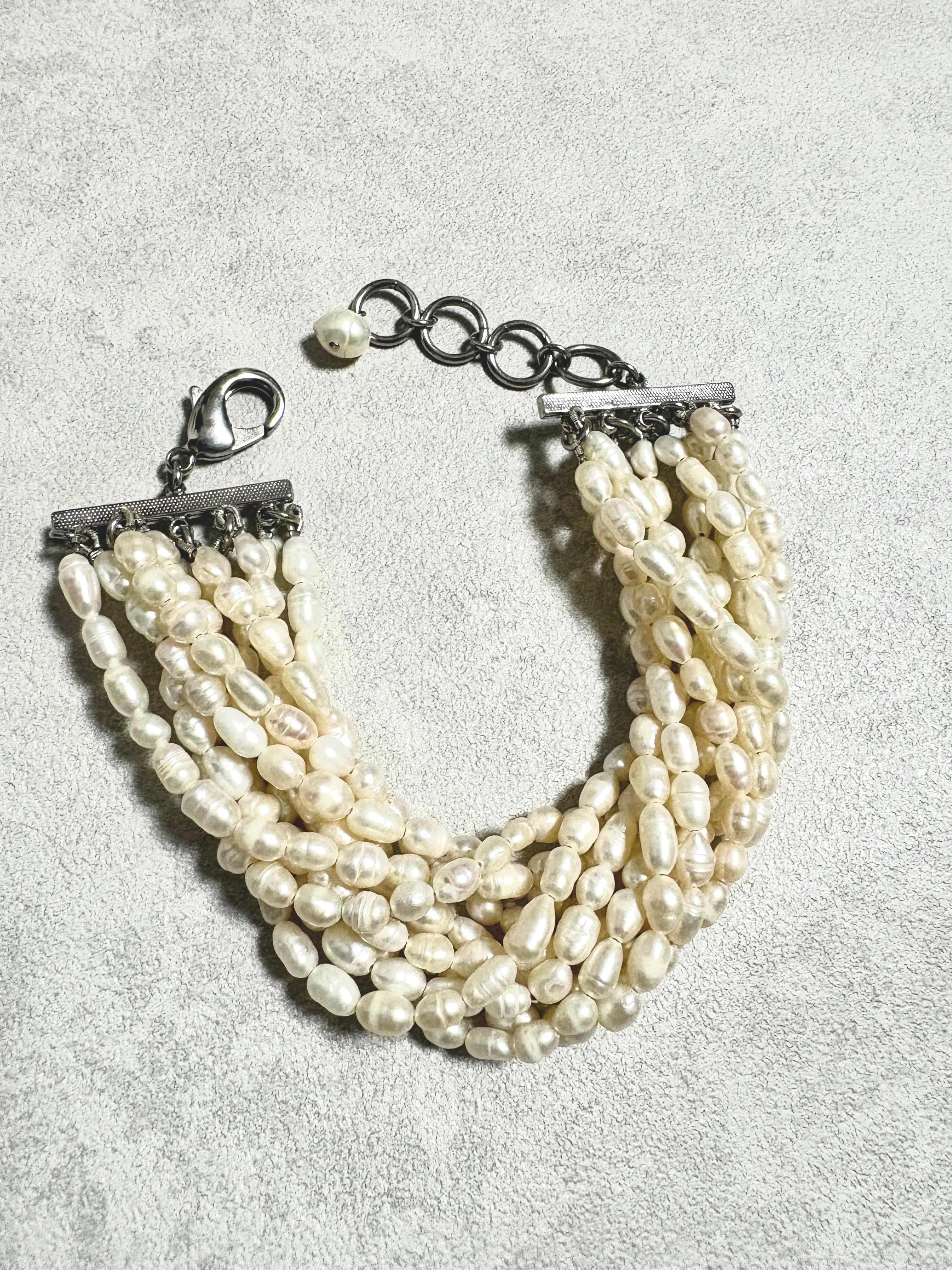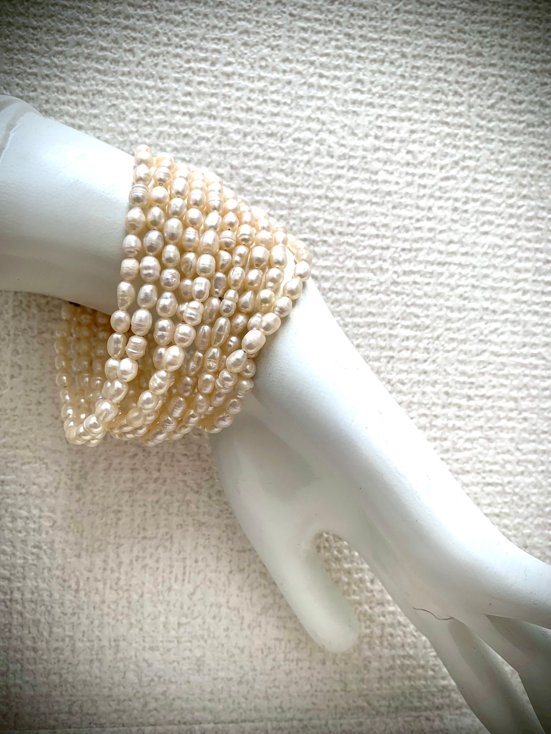 小粒の淡水パールを10連のブレスレットに仕立てたゴージャスなアイテム。パーティシーンにも、カジュアルコーデの格上げにも使える万能アイテムです。