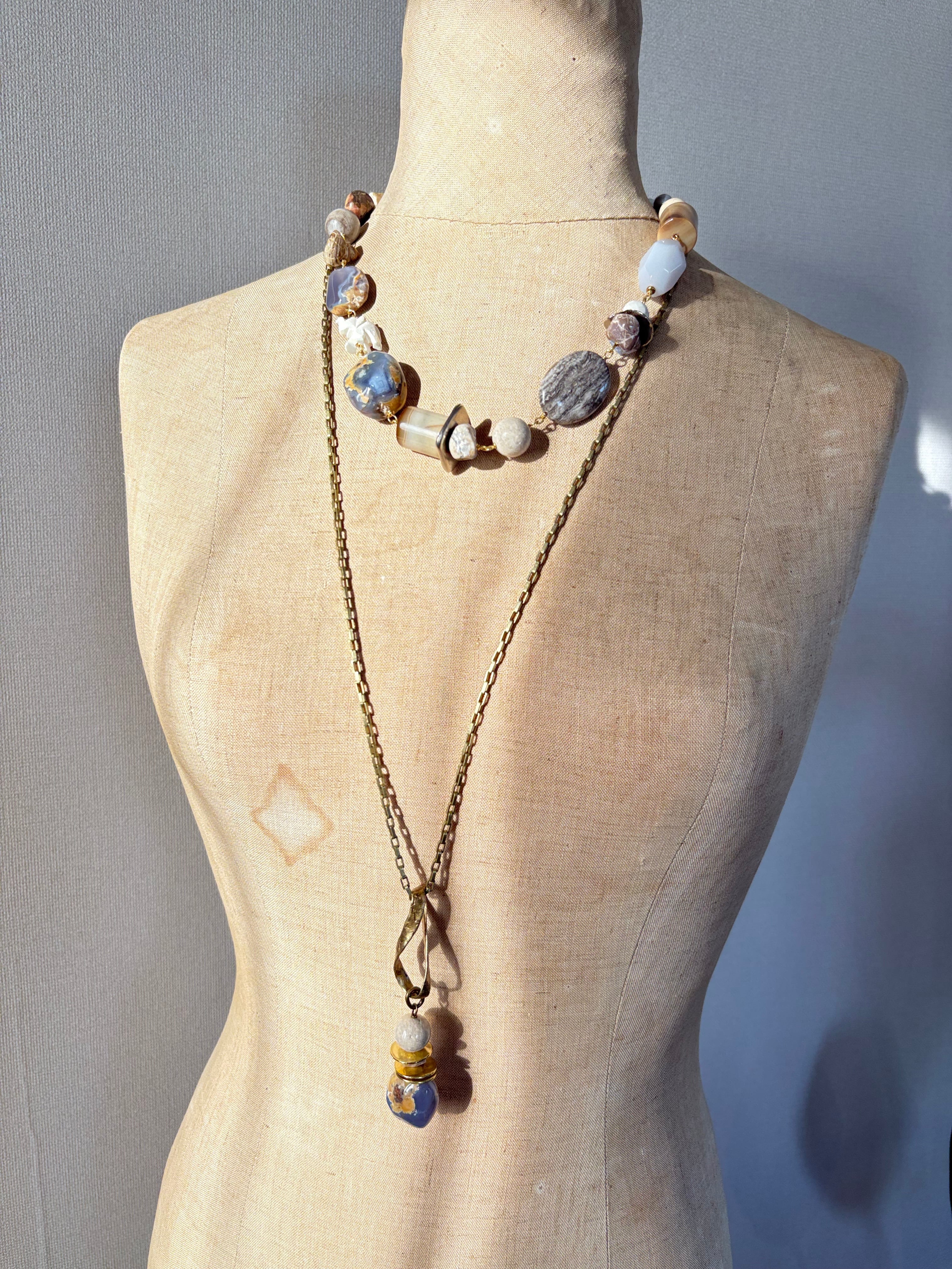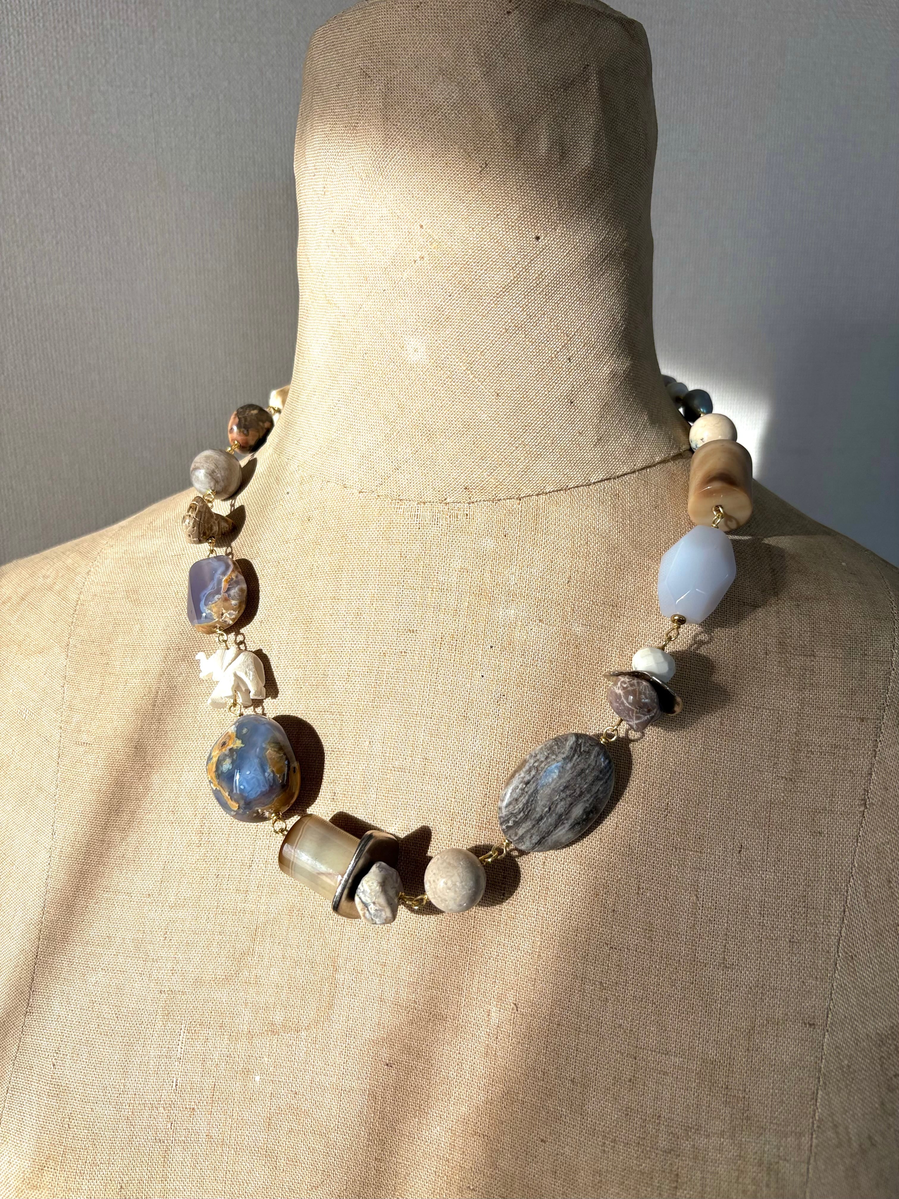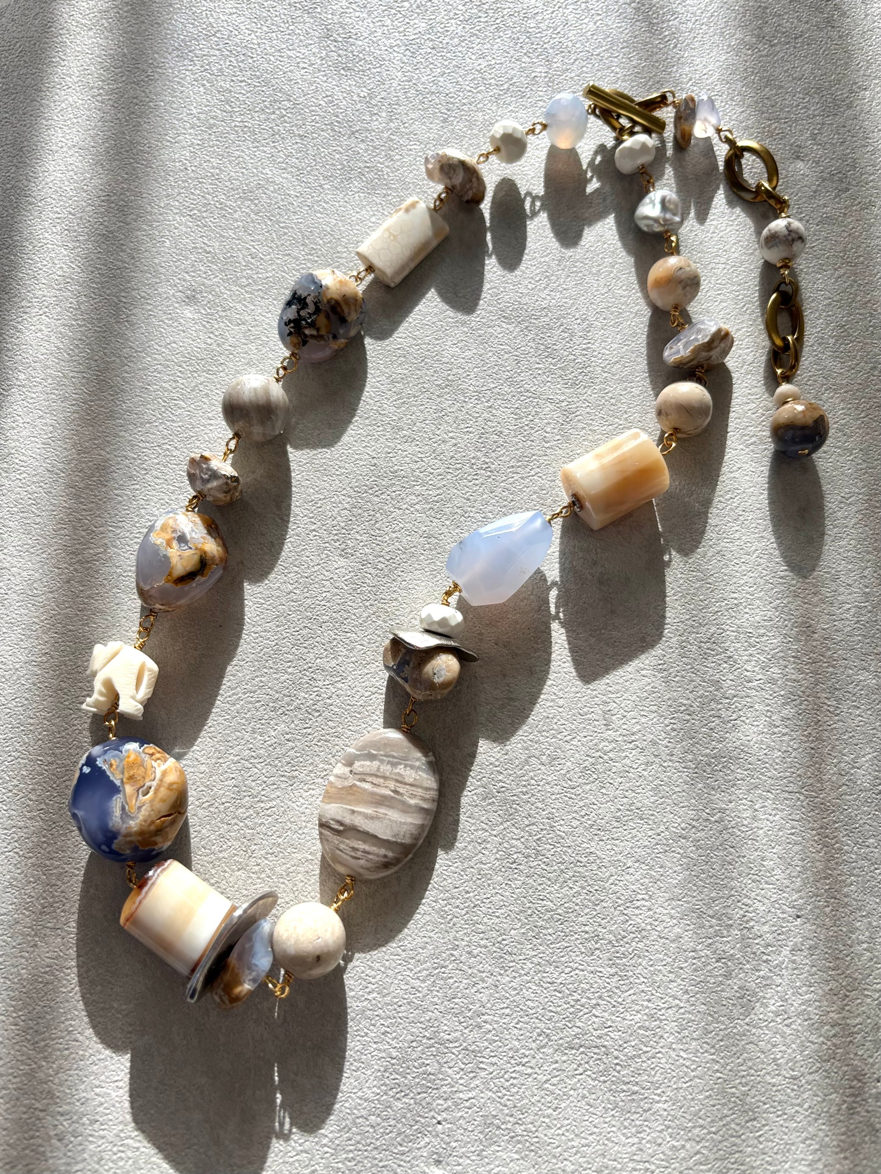 優しいミルクブルーの母岩つきカルセドニーが主役のマルチストーンネックレスです。バッファローホーンで出来た手彫りの象が遊び心をプラス。
