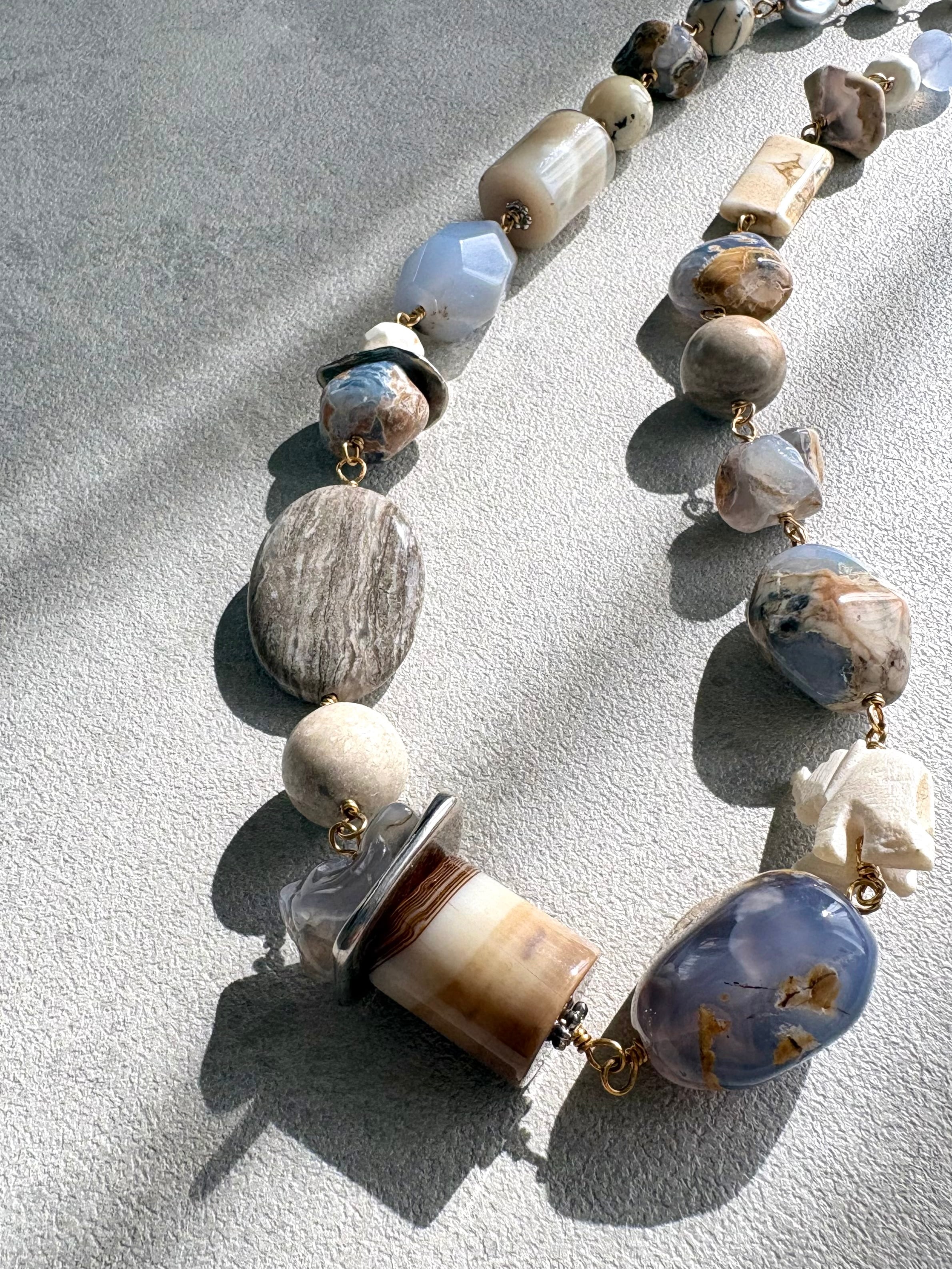 material : 母岩つきカルセドニー、ブルーレースアゲート、アフリカンオパール、シルバーリーフジャスパー、ブラウンストライプアゲート、マグネサイト、淡水パール、真鍮