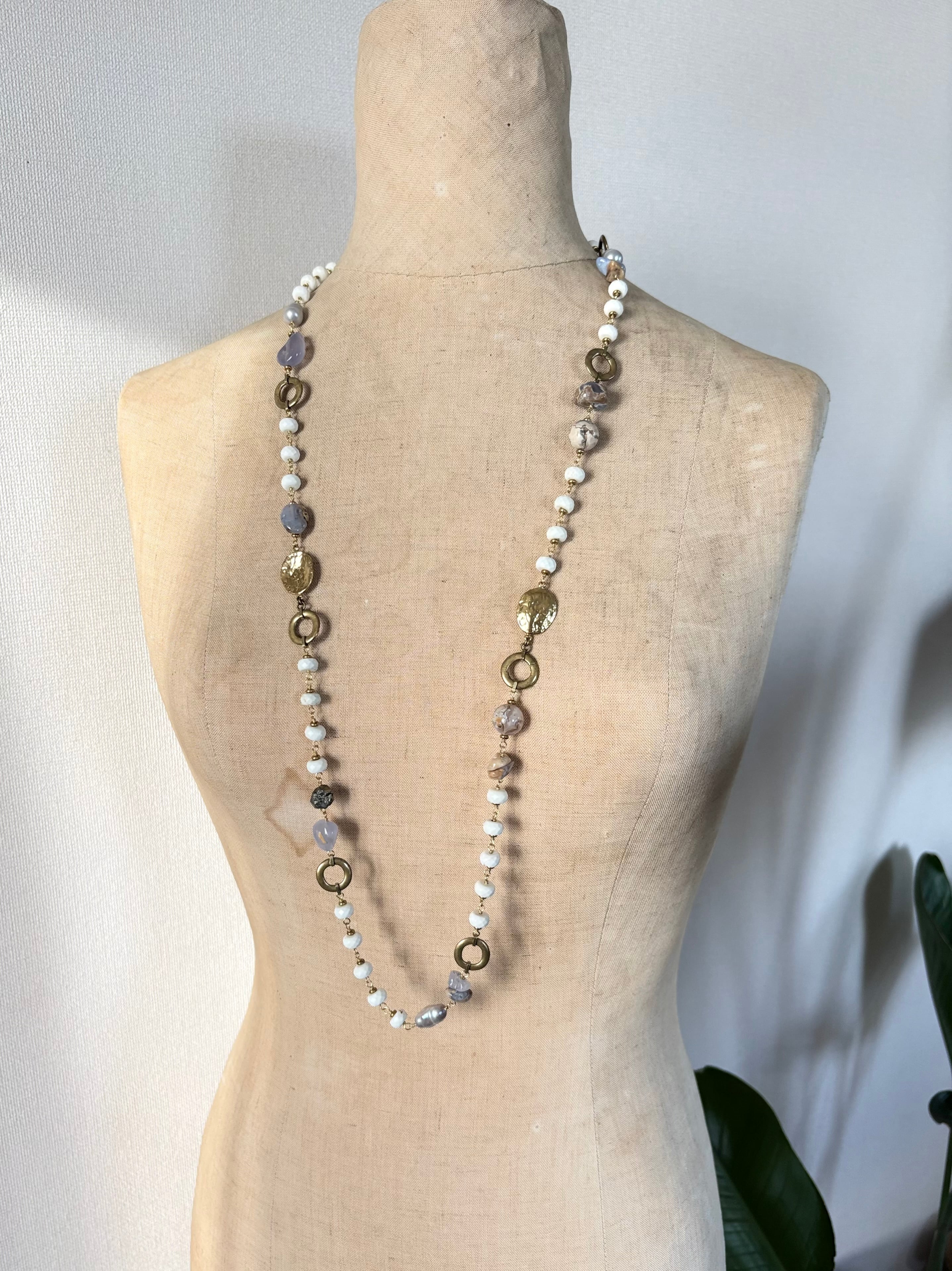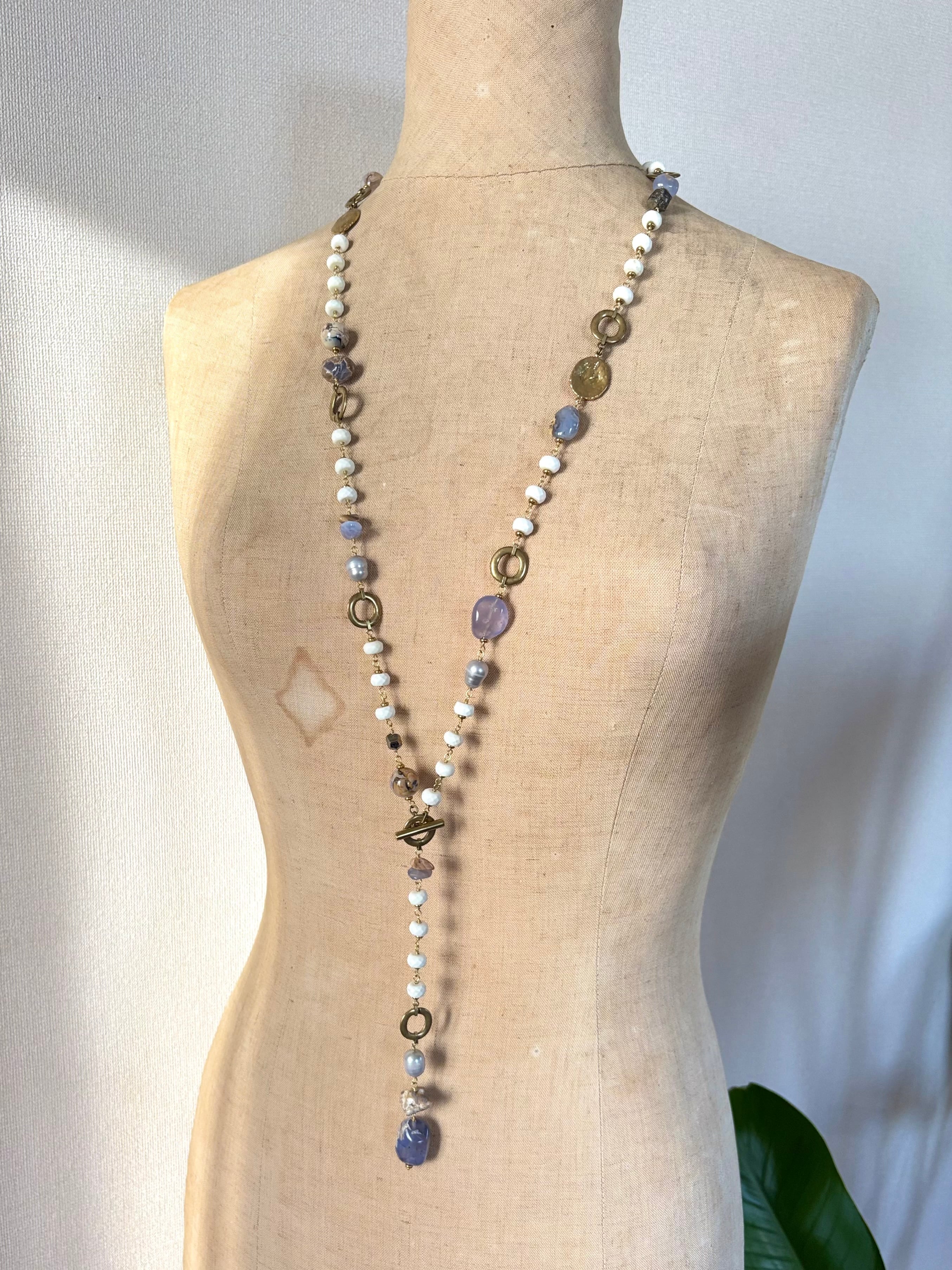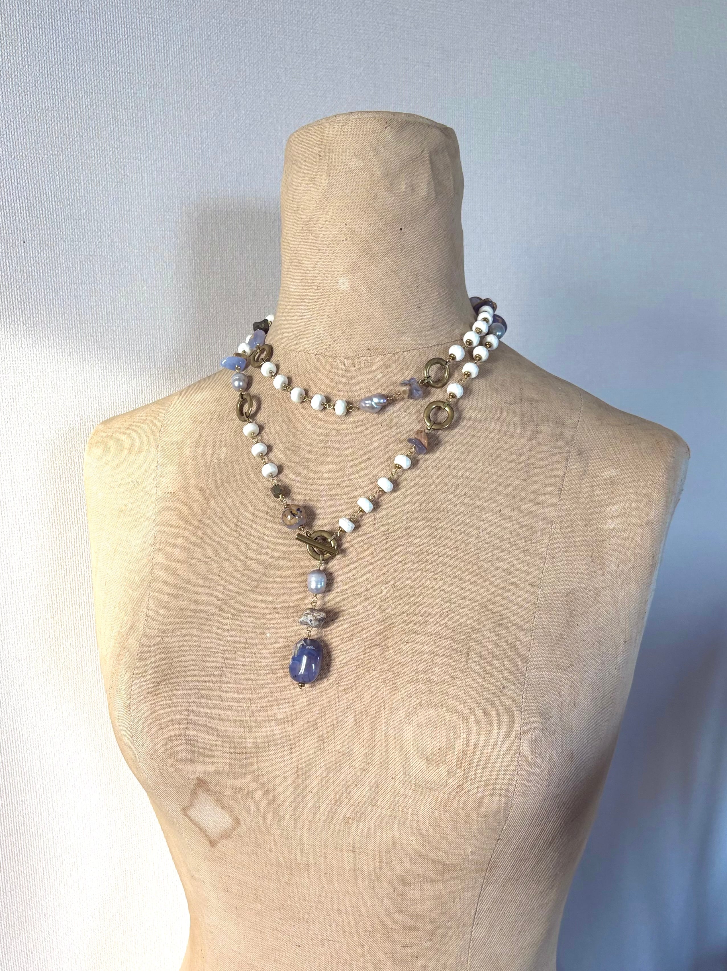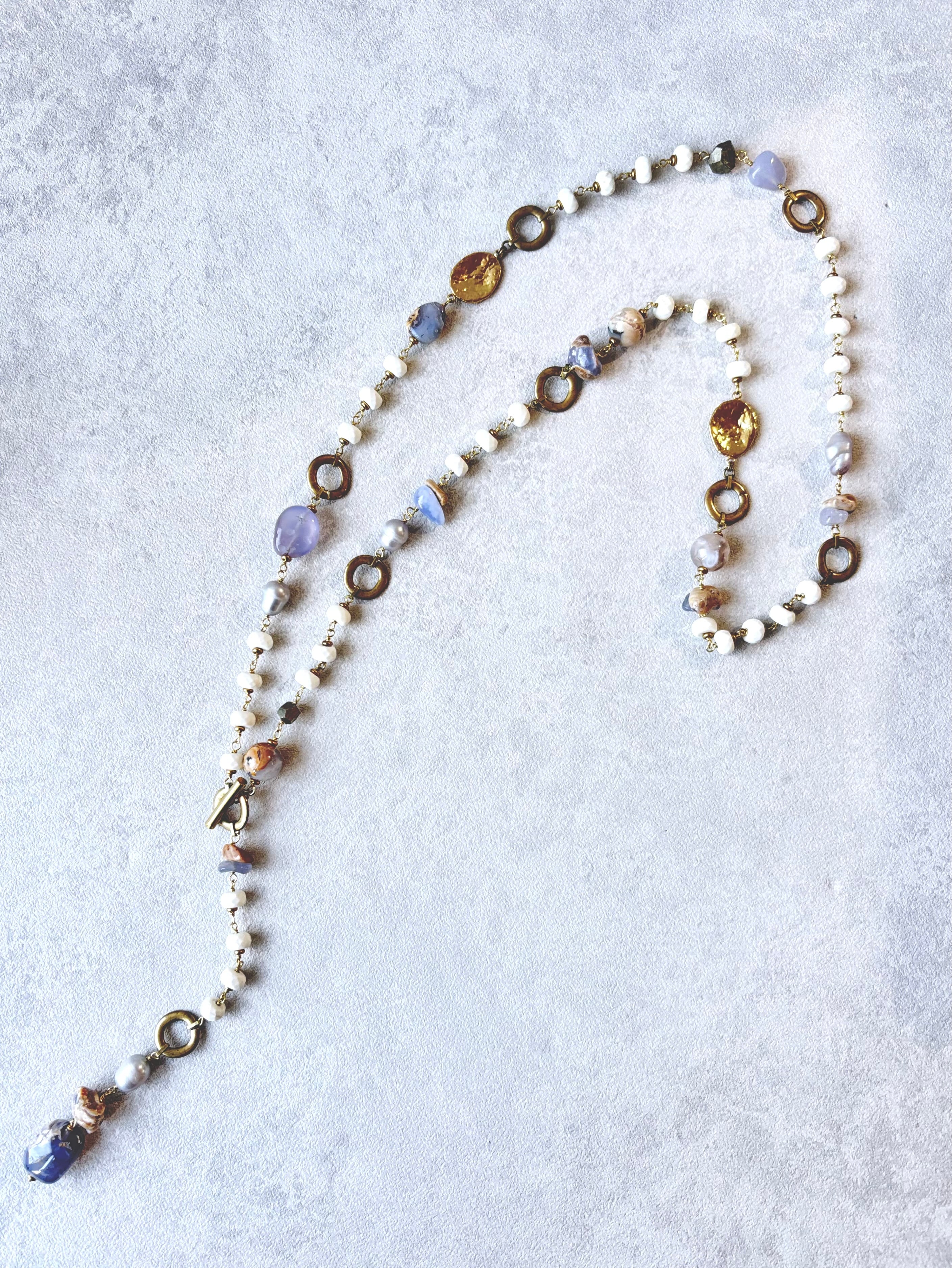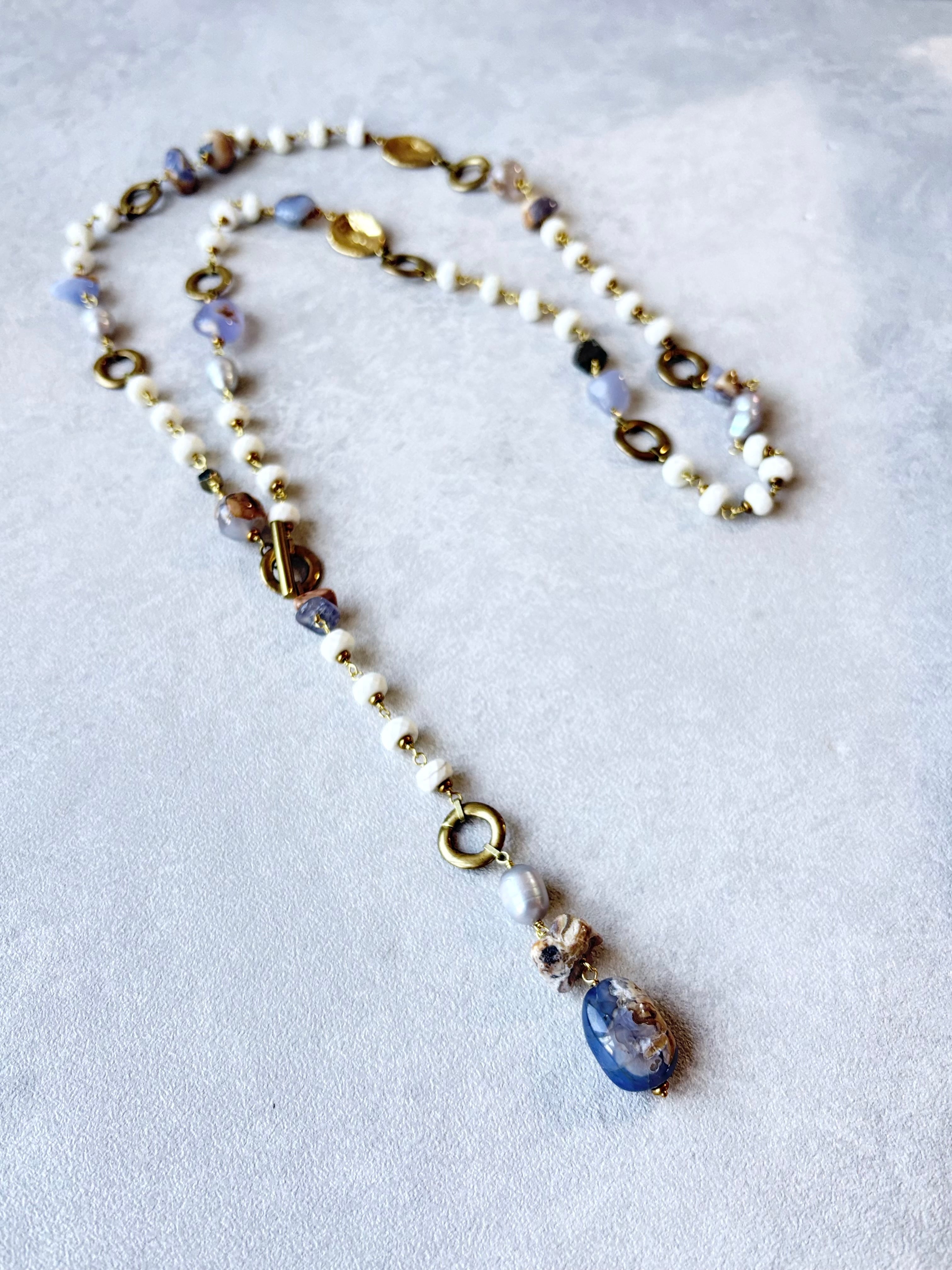 母岩つきカルセドニーのミルクブルーとマグネサイトの優しいホワイトがとけあうロングネックレス。