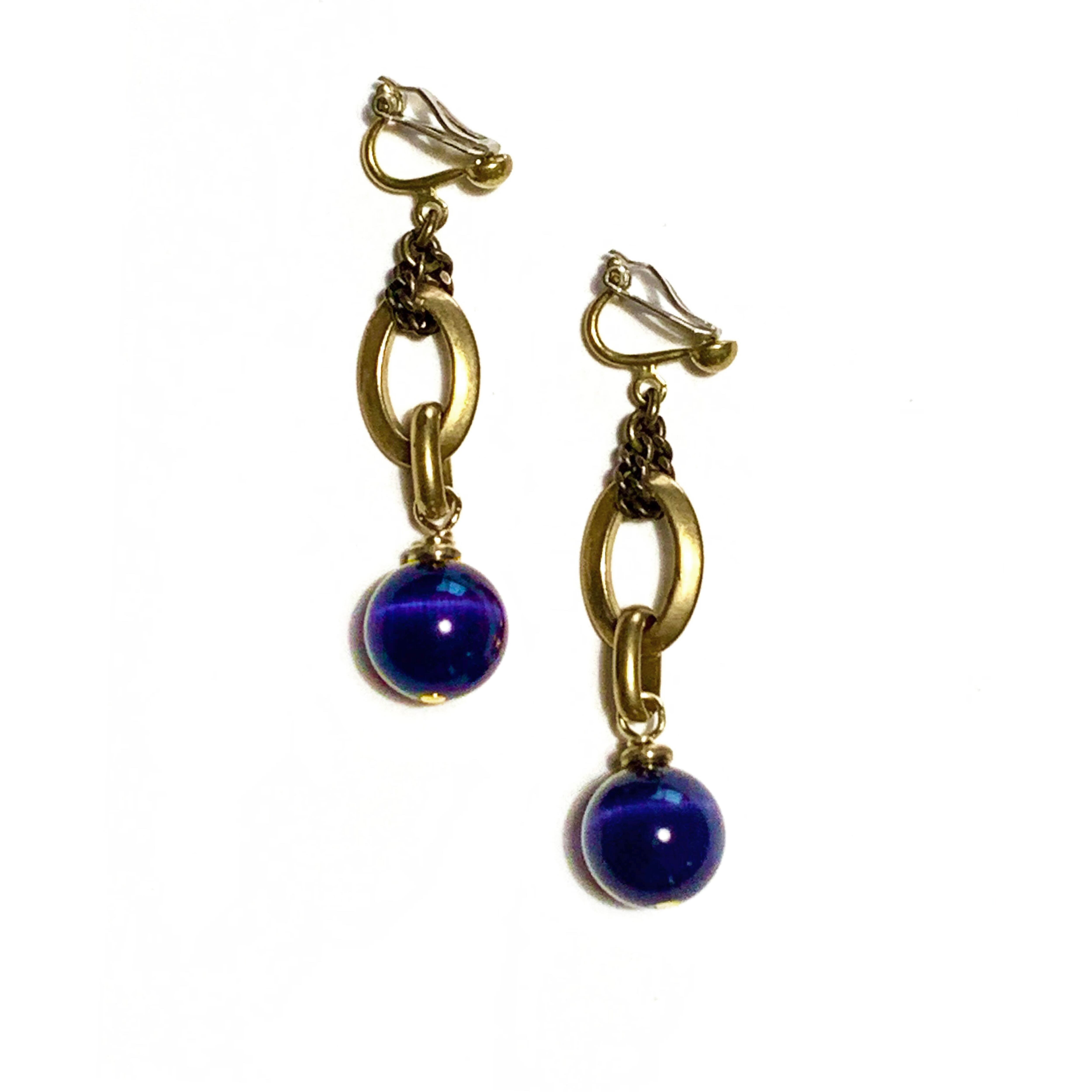 コロンとしたパープルのキャッツアイグラスのキュートさと、シックなアンティークゴールドが絶妙なバランスのアイテムです。